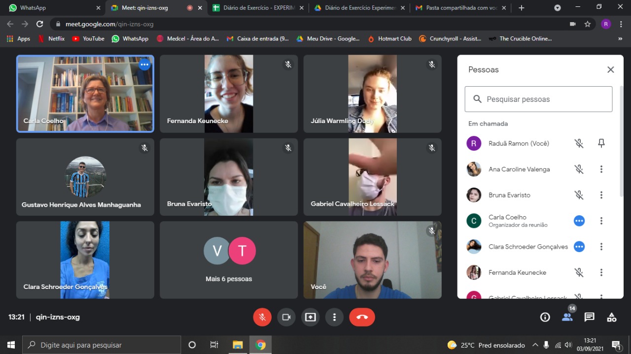 Assim, as atividades acontecem da seguinte maneira: (1) realização de uma avaliação física presencial; (2) uma vez na semana sessão de reabilitação domiciliar síncrona acompanhada via on-line (Google meet); (3) duas vezes na semana sessão de reabilitação domiciliar assíncrona (paciente realiza sozinho e posteriormente relata a rotina de exercícios) e (4) palestras sobre educação para a saúde (Google meet).