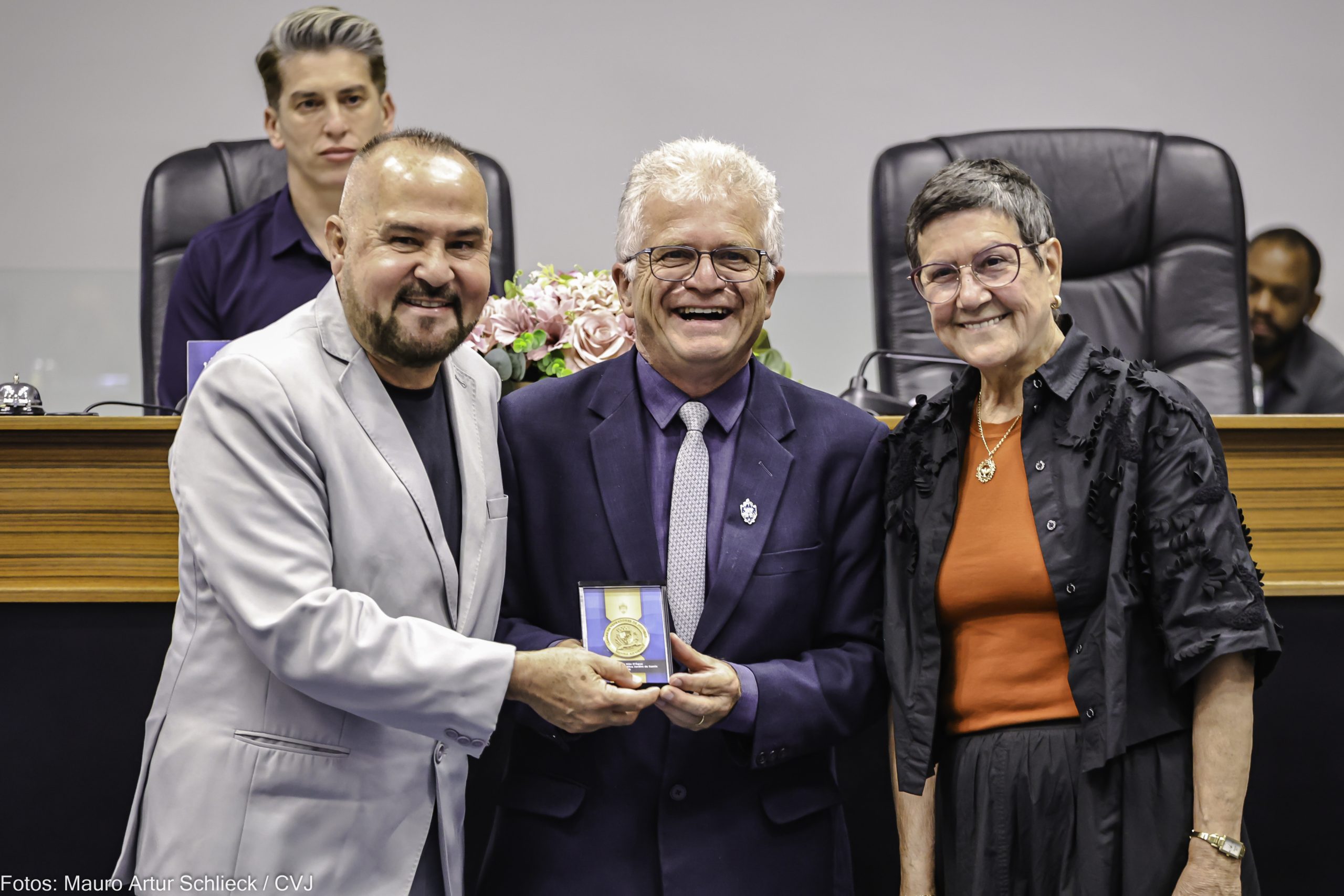 da esq.: Prof. Luiz Henrique Rodrigues, Vereador Henrique Deckmann e idealizadora Cleusa Maria Schneider
